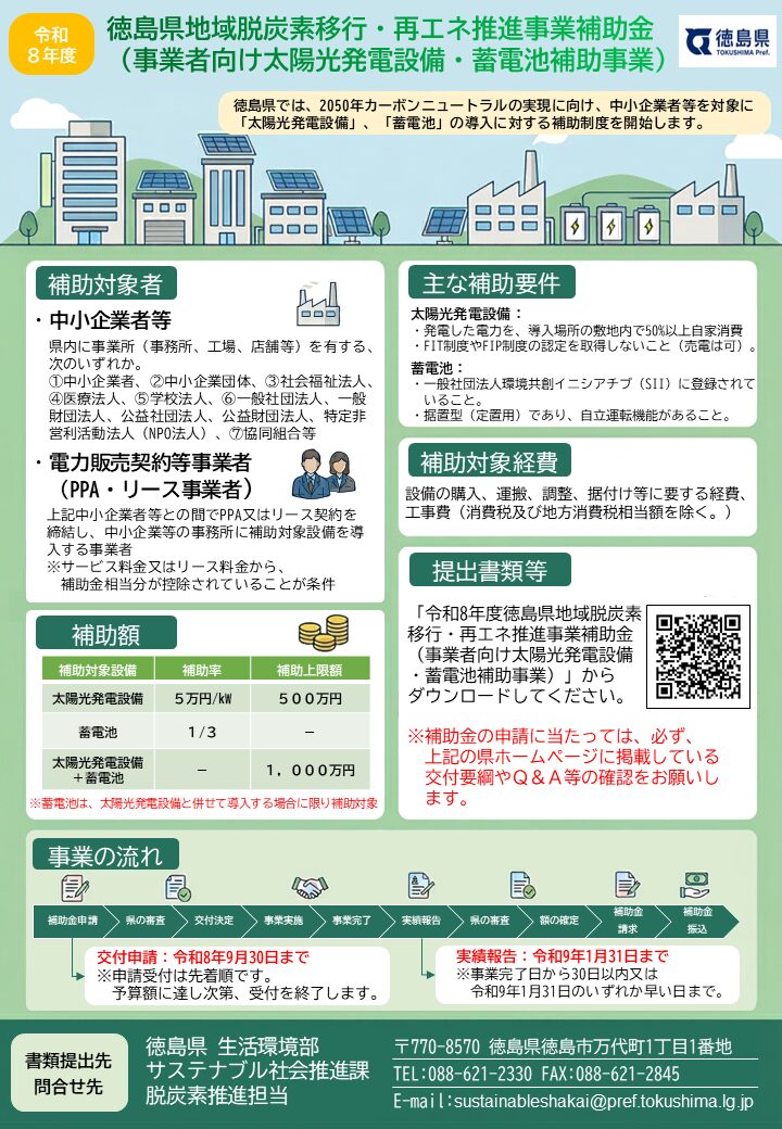 【補助金】徳島県:事業者向け太陽光発電設備・蓄電池補助事業