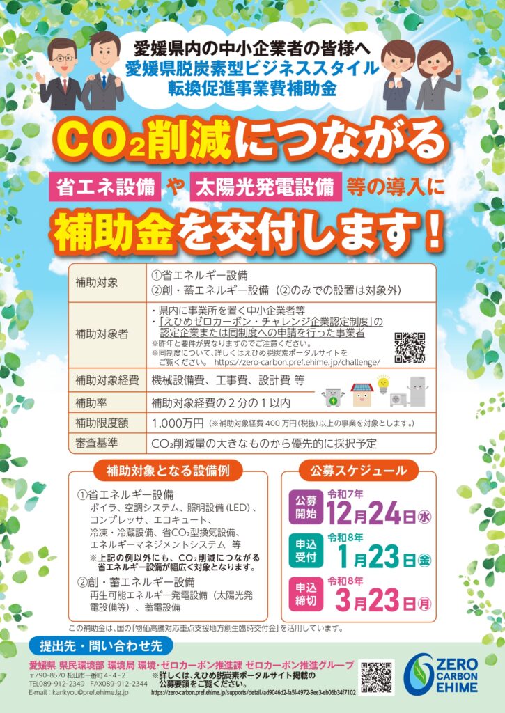 愛媛県より「脱炭素型ビジネススタイル転換促進事業費補助金」の公募情報が公開されました!