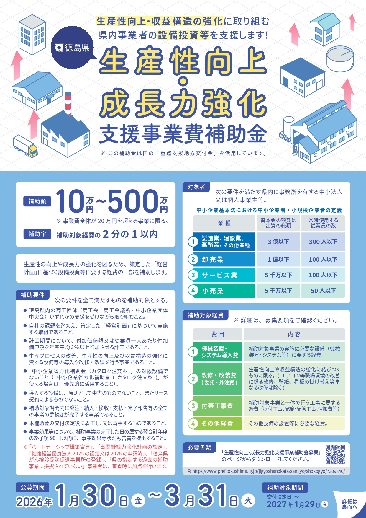 | 要件 | 1.徳島県内の商工会議所、商工会又は中小企業団体中央会のいずれかの支援機関の支援を受けながら策定した「経営計画(3年)」に基づいて実施する取組であること。 2.前項の計画期間において、付加価値額又は従業員一人当たりの付加価値額を年率平均3%以上増加させる計画であること 3.令和9年1月29日(金)までに事業(支払)完了すること |